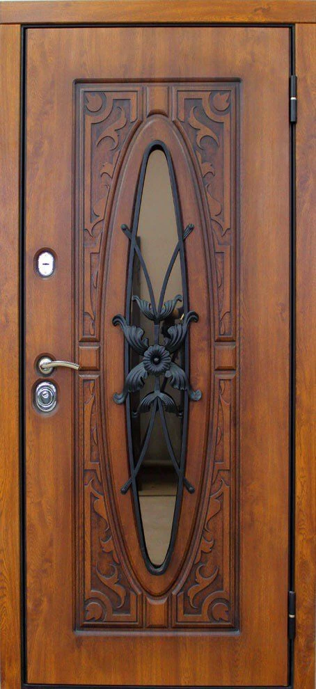 Часто декорирование дверей ковкой используют вместе со стеклом, отделывают витражным узором, используют зеркальные вставки. Стекло в этом случае применяется антивандальное, с трудом поддающееся разрушению.